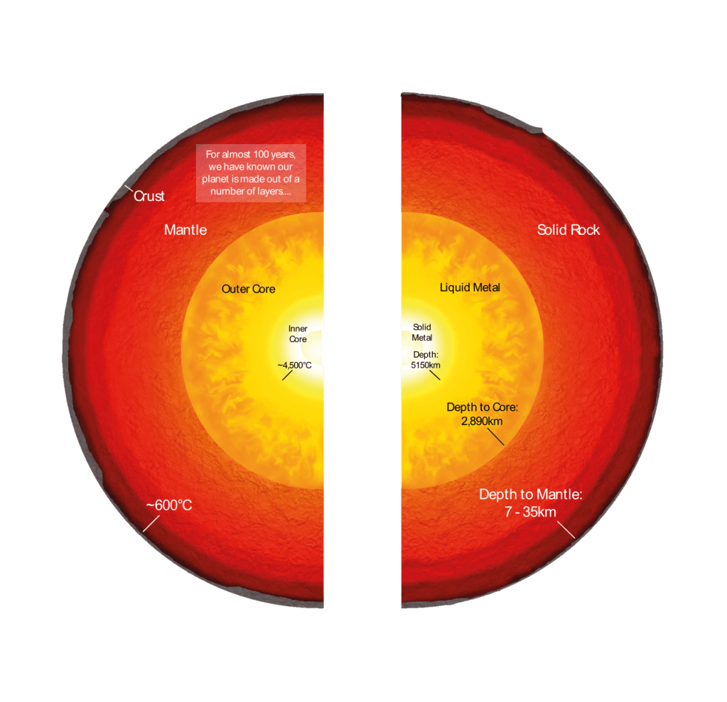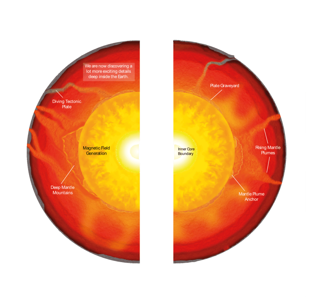 Created with Amalgam Model Makers the Earth Model is read like a book, wherein the museum public can turn the panels to reveal hidden details. The Earth Model panel on the left below opens to show the graphics on the right. The museum public helped create new memorable ‘nicknames’ for notable Deep Earth Explorer research with LLVPs becoming “deep mantle mountains” and ULVZs “mantle plume anchors.” The online exhibit below is designed to “zoom” deep into the Earth images below using a mouse or trackpad. This enables investigation of features and discovery of key facts around distance to the core, state of material and temperature inside the Earth.